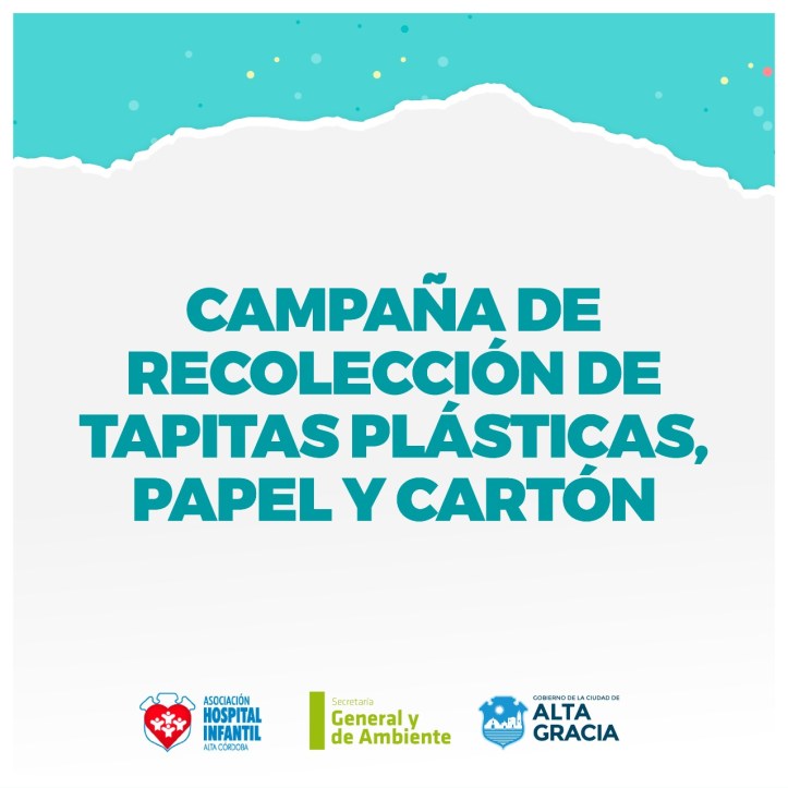 La Municipalidad de Alta Gracia a través del Programa “Alta Gracia Más Verde” de la Secretaría General y de Ambiente, se suma a la campaña solidaria de la Asociación Hospital Infantil; para la recolección de tapitas, papel y cartón que serán reciclados para obtener recursos destinados a proyectos de asistencia, promoción, prevención y compra de aparatología hospitalaria.