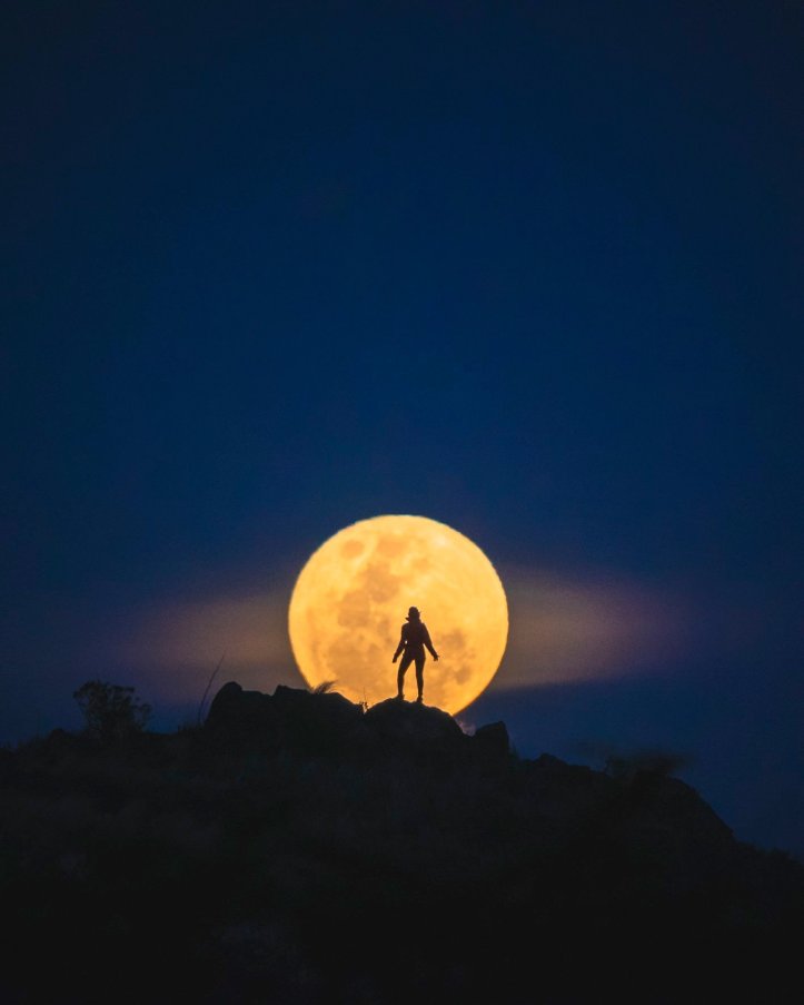 Esta vez, Gonzalo nos regala una toma de la luna, a poco de que la misma apareciera por sobre el horizonte, y tras las «piedras» de nuestras serranías y con una figura humana por delante.
