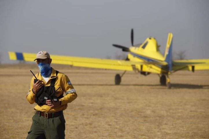 Otro de los lugares con incendios es en proximidad de la localidad de Achiras en donde trabajan unos 65 bomberos procuran detener la quema de pastizales.