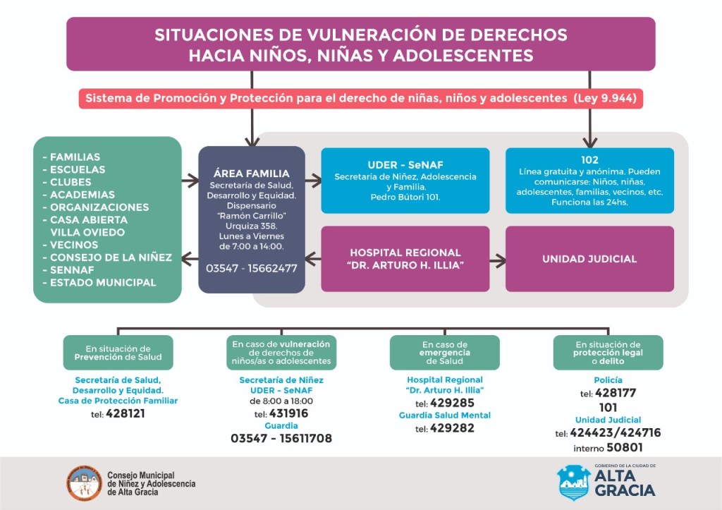 El Gobierno de la Ciudad de Alta Gracia, junto con el Consejo Municipal de la Niñez y Adolescencia, pone a disposición de la comunidad los contactos de las instituciones que tienen la finalidad de proteger a los niños, niñas y adolescentes en caso de situaciones de vulneración de sus derechos.