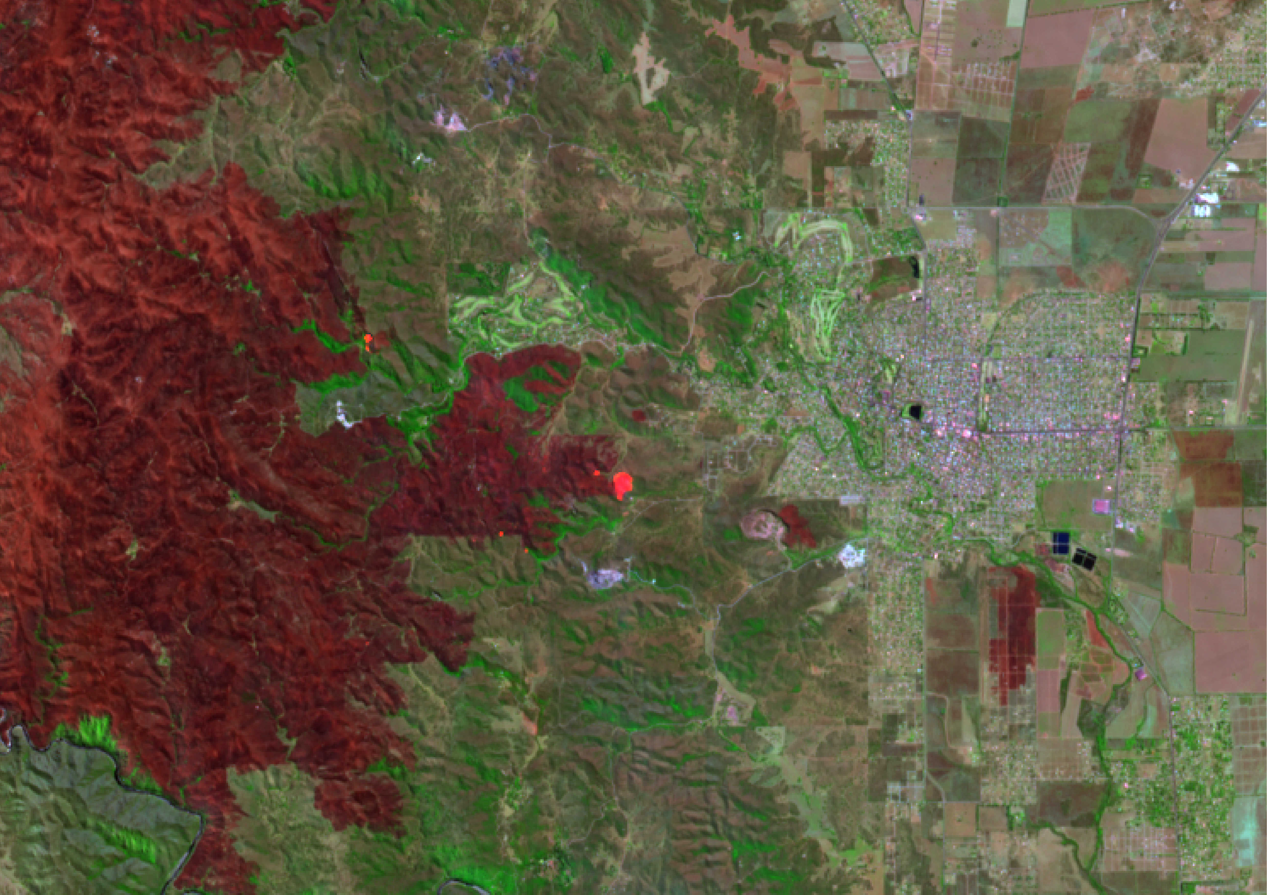 A continuación en las imagen tomada por el satélite Sentinel 2 el 29 de septiembre, puede apreciarse el área afectada con incendios en los alrededores de las localidades de Alta Gracia. En rojo y bordó se ven las áreas quemadas y en naranja los frentes activos de fuego.
