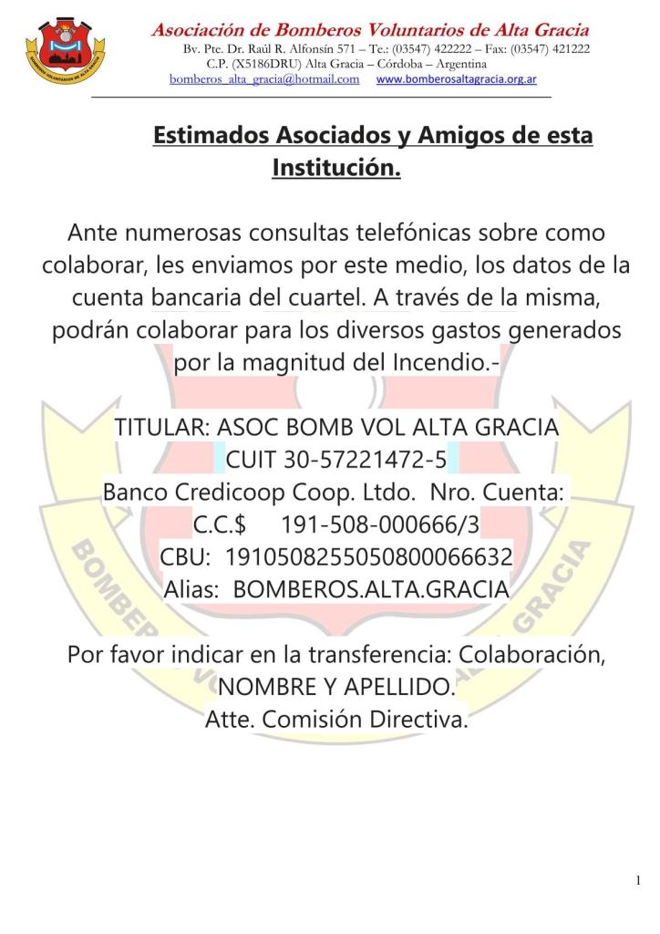 Si bien por estos días no hay focos activos en esta parte de la Provincia, Bomberos de Alta Gracia están ayudando en la zona de Alpa Corral y los de Villas Ciudad de América en Cruz de Caña.