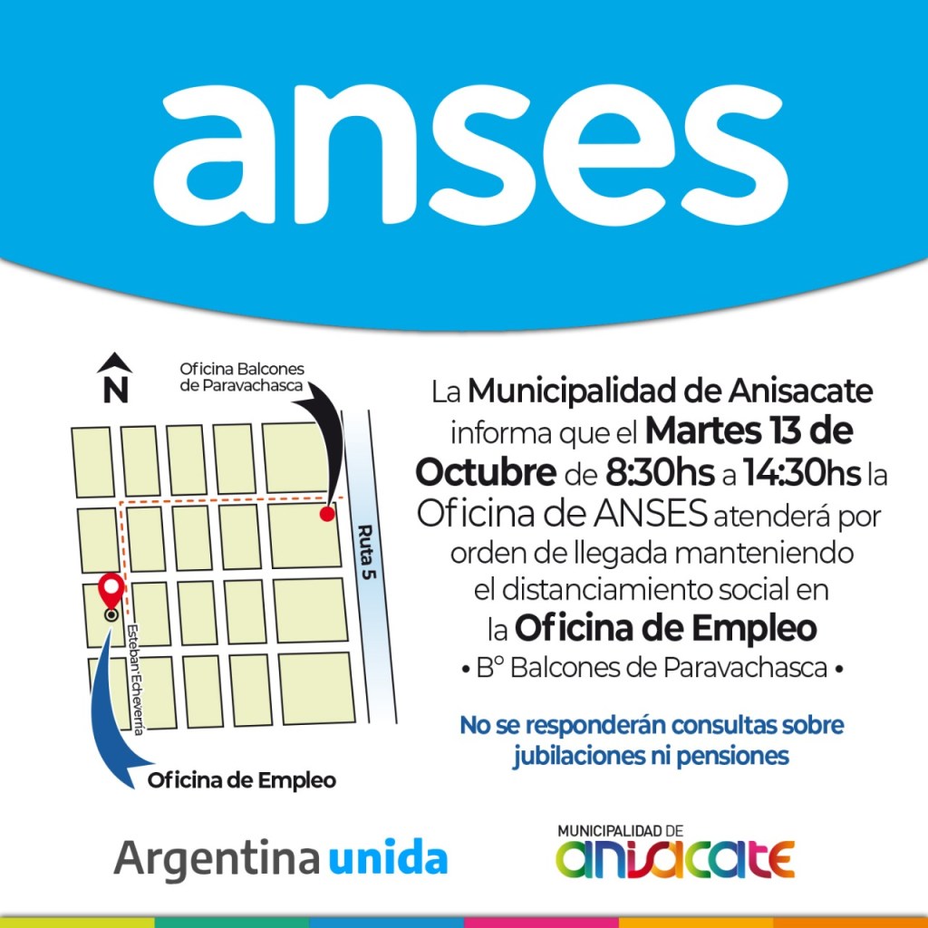 Este martes 13 de octubre, una delegación de ANSES atenderá en la Oficina de Empleo de Anisacate, ubicada en el barrio Balcones de Paravachasca.