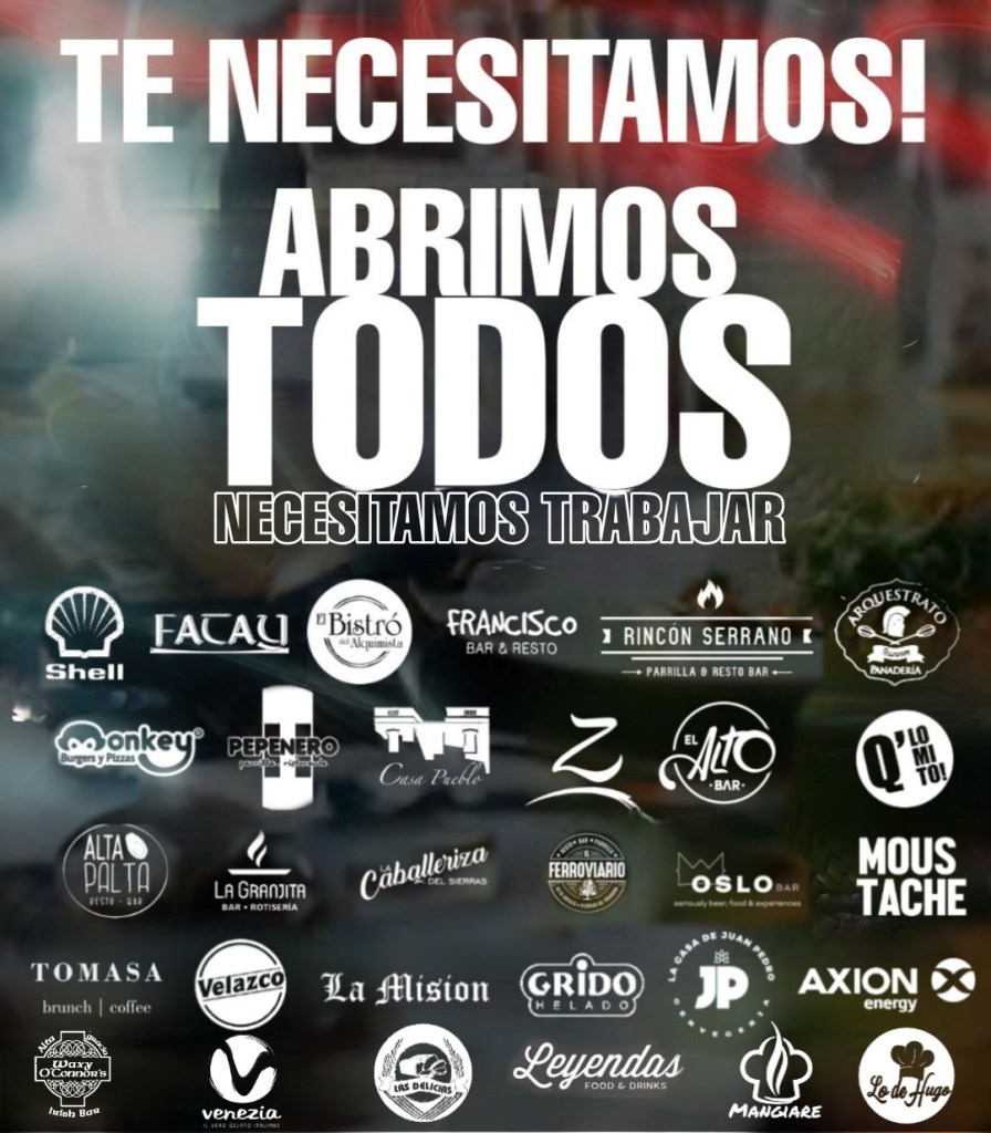 Por ello desde el sector gastronómico de Alta Gracia se unieron bajo una zona consigna denominada: «TE NECESITAMOS! ABRIMOS TODOS. NECESITAMOS TRABAJAR».