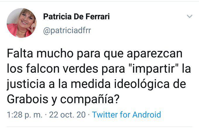 “¿Falta mucho para que aparezcan los Falcon verdes para ‘impartir’ justicia a la medida de Grabois y compañía?”, había escrito De Ferrari la semana pasada, cuando quiso cuestionar el accionar de la Justicia en el marco de la disputa que el ex Ministro de Agricultura, Luis Etchevehere, plantea contra su hermana por unos terrenos ubicados en la Provincia de Entre Ríos. Ante la lluvia de críticas, la legisladora de Juntos por el Cambio había borrado dicho mensaje al advertir que había sido “malinterpretado”.