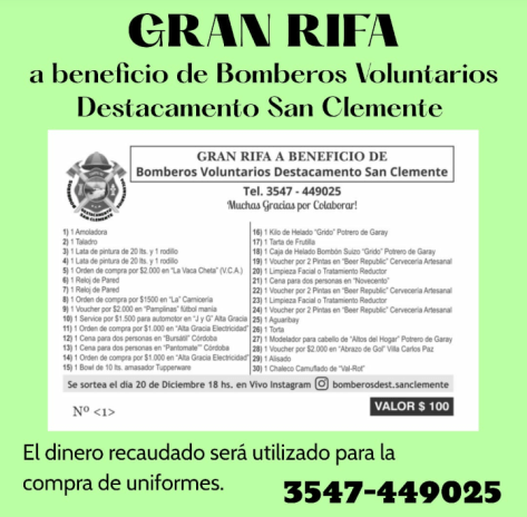 Para solventar los gastos se realizó una rifa que sorteará el próximo 20 de diciembre, la cual todavía se encuentra con números disponibles para la venta, a $100 cada uno. Los mismos se pueden encargar, contactándose al siguiente teléfono: 3547-449025