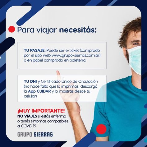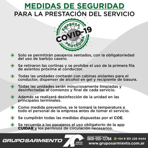 En el caso de esta primera empresa, desde Sierras de Calamuchita informaron que ya se han tomado las medidas de prevención expuestas en el protocolo del COE; por lo que, entre otras cosas, los colaboradores utilizarán barbijo y dispondrán de alcohol en gel para continuamente higienizar sus manos; las unidades serán sanitizadas y se tendrá el registro de los pasajeros de todos los servicios.
