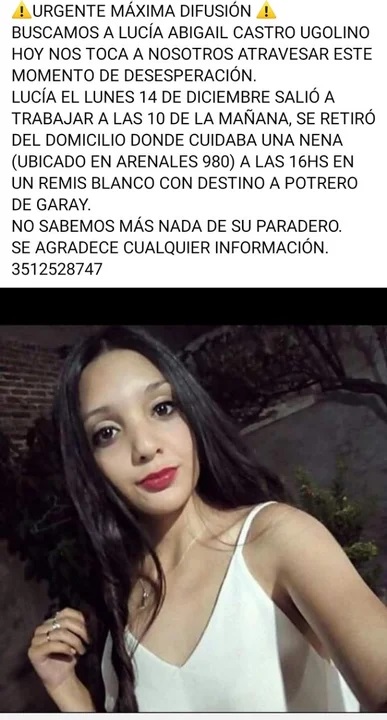Lucía Abigail Castro Ugolino tiene 22 años y fue vista por última vez en el día de ayer a las 16 hs en B° General Paz de Córdoba Capital. Vestía pantalón negro, zapatillas negras y barbijo rosa. Tiene pelo largo lacio negro hasta la espalda, ojos redondos marrones, 1.60 m de estatura y brackets estéticos