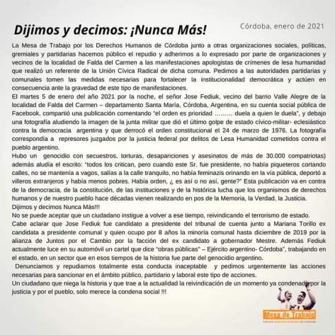 «El martes 5 de enero del año 2021 por la noche, el señor Jose Fediuk, vecino del barrio Valle Alegre de la localidad de Falda del Carmen, departamento Santa María, Córdoba, Argentina, en su cuenta social pública de Facebook, compartió una publicación comentando “el orden es prioridad ……… duela a quien le duela”, y debajo una fotografía aludiendo la imagen de la junta militar que dió el último golpe de estado cívico-militar- eclesiástico contra la democracia argentina y que derrocó el orden constitucional el 24 de marzo de 1976. La fotografía correspondía a represores juzgados por la justicia federal por delitos de Lesa Humanidad cometidos contra el pueblo argentino. Hubo un genocidio con secuestros, torturas, desapariciones y asesinatos de más de 30.000 compatriotas) además aludía el escrito: “todos los critican, pero cuando este Sr. fue presidente, no había piqueteros cortando calles, no se mantenía a vagos, salías a la calle tranquilo, no había feminazis orinando en la vía pública, deportó a villeros extranjeros y había menos pobres. Había orden, ¿es así o no así, gente?” Esta publicación va en contra de la democracia, de la constitución, de las instituciones y de la histórica lucha que los organismos de derechos humanos y de nuestro pueblo hace décadas vienen realizando en pos de la Memoria, la Verdad, la Justicia»; agrega el texto.
