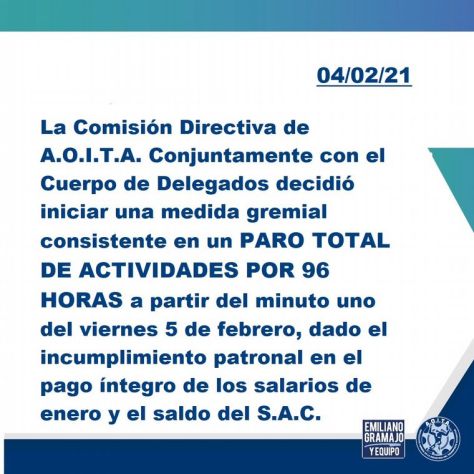 «Lamentablemente tuvimos que tomar esta decisión atentos a que no se abonaron íntegramente los salarios de enero y un saldo del Sueldo Anual Complementario (SAC) que había quedado establecido en el último acuerdo firmado», señaló el dirigente.