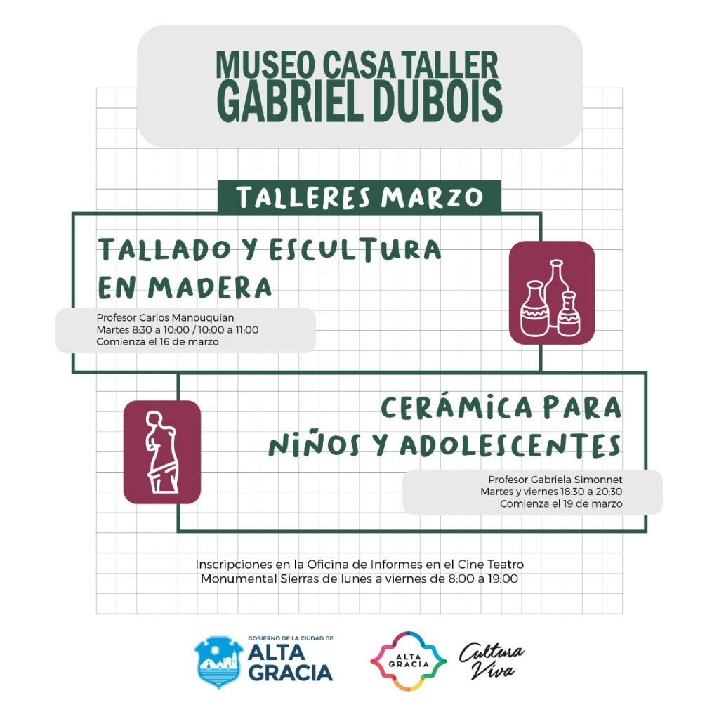 El Municipio de Alta Gracia a través de la Dirección de Cultura, informa los nuevos talleres que comienzan en marzo en el Museo Gabriel Dubois.