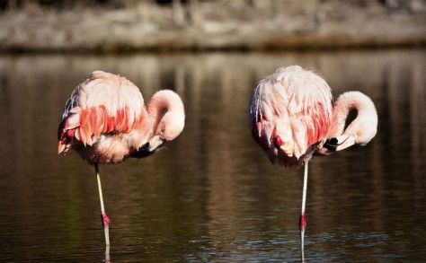 Nacen con un plumaje grisáceo, amarronado o blanco pero al llegar a la madurez las plumas toman tonalidades rosadas porque se alimentan de algas y crustáceos propios del lugar, que contienen pigmentos.