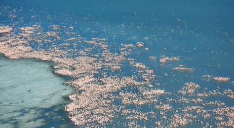 Durante los últimos censos se observaron cientos de miles de flamencos nidificando en la laguna.