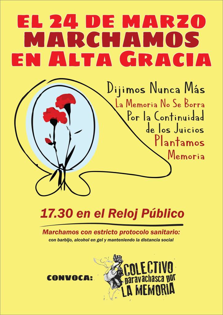 El Colectivo Paravachasca por la Memoria anuncia que este miércoles 24 de marzo, se volverá a marchar en Alta Gracia, en el marco del “Día Nacional de la Memoria por la Verdad y la Justicia”, a 45 años del inicio de la dictadura cívico militar y eclesiástica que azotó a nuestro país entre 1976 y 1983.