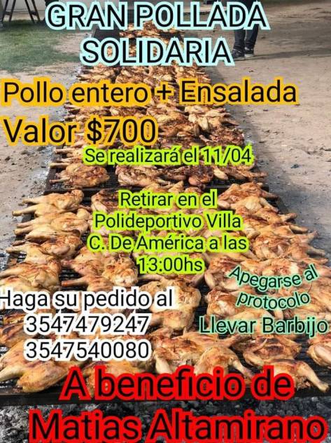 Por su parte, este sábado 11 tendrá lugar la pollada solidaria; siendo el valor del pollo entero con ensalada, de $700. La entrega se realizará en el Polideportivo de Villas Ciudad de América, a partir de la hora 13. Quienes deseen colaborar, deben comunicarse a los siguientes teléfonos: 3547-479247 ó 3547-540080.