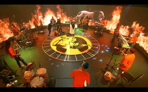 Visiblemente entusiasmado, un Jiménez movedizo se ubicó en el centro de un escenario circular. En un círculo grande, su banda se ubicó en línea con la pared de pantallas de espaldas a los músicos y marcó los límites de la puesta en escena. Más adentro, otro círculo más pequeño reservado para el traslado de una cámara que captó los primeros planos del cantante.