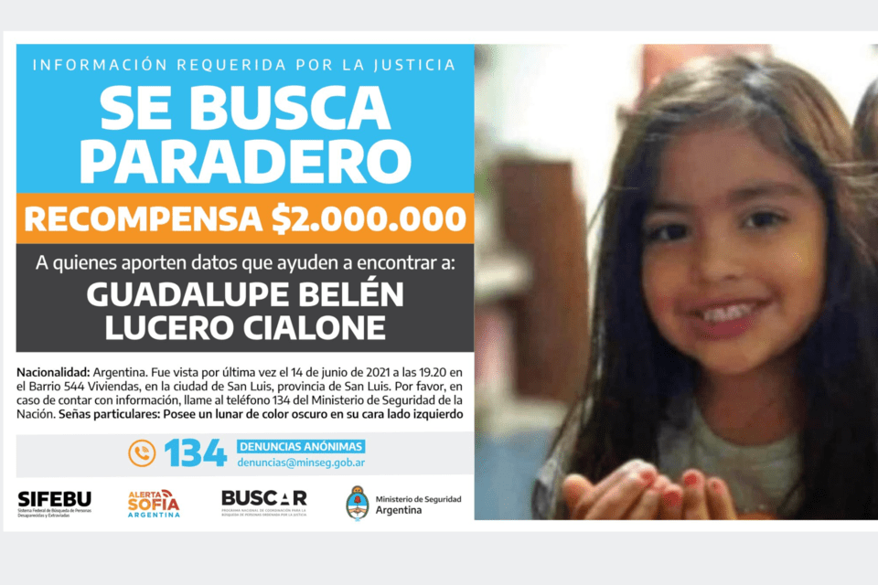 La búsqueda de Guadalupe Lucero no cesa y en la mañana de este viernes el Gobierno nacional oficializó el ofrecimiento de una millonaria recompensa a quien aporte datos sobre la nena desaparecida en San Luis.