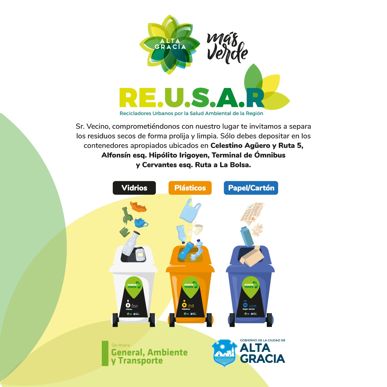 El Gobierno de la Ciudad de Alta Gracia, a través del Programa Alta Gracia Más Verde de la Secretaría de Ambiente, implementó el proyecto “RE.U.S.A.R” (recicladores urbanos por la salud ambiental de la región) que invita a los vecinos a separar los residuos secos de forma prolija y limpia y depositarlos en contenedores apropiados que estarán dispuestos en distintos puntos de la ciudad.