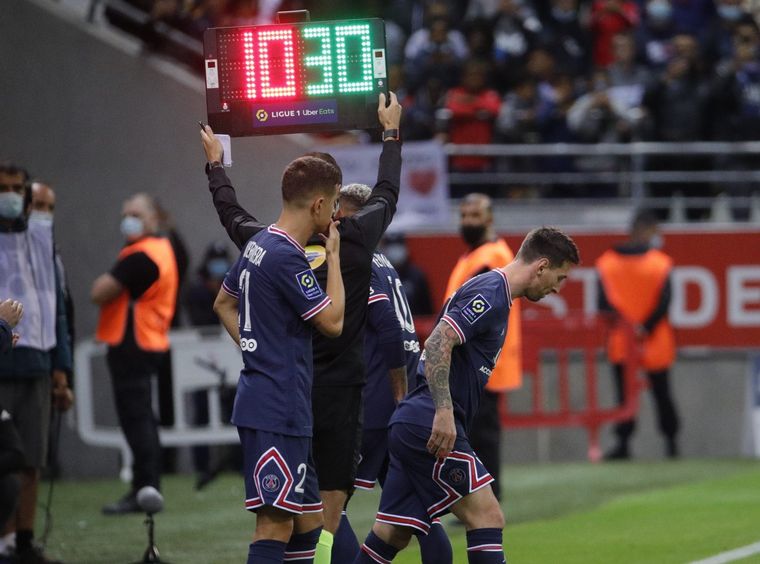 La «Pulga» ingresó al campo de juego minutos después en reemplazo de su amigo Neymar Jr, vistiendo así por primera vez en 21 años una camiseta distinta a la del Barcelona.