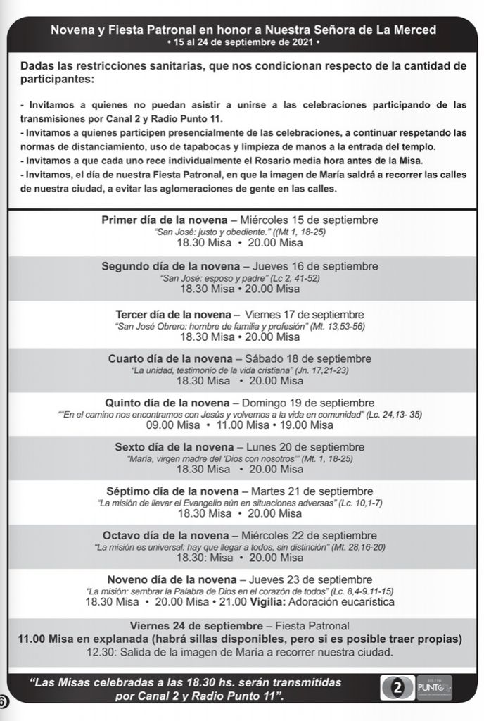 De esta manera, hasta el 23 de septiembre inclusive se estará realizando el rezo de la novena, con dos misas cada día, cumpliendo con todos los protocolos vigentes, a las 18:30 y a las 20:00 horas.