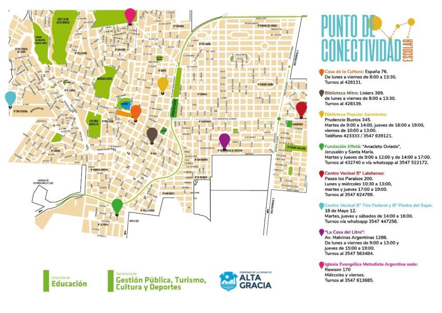 Luego de la firma de convenios entre el Gobierno de Alta Gracia y diversas instituciones y organizaciones, toda la comunidad educativa ya puede acceder a servicios de internet e impresiones gratuitas en 8 puntos estratégicamente ubicados en distintas zonas de la ciudad.