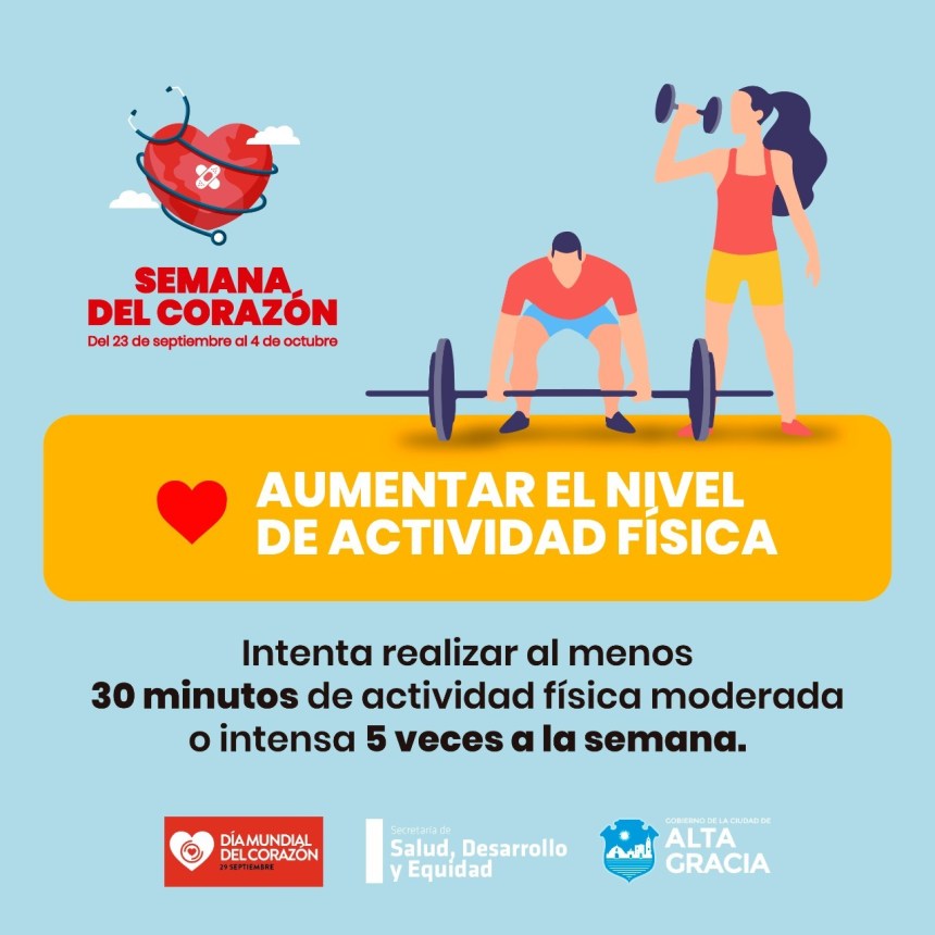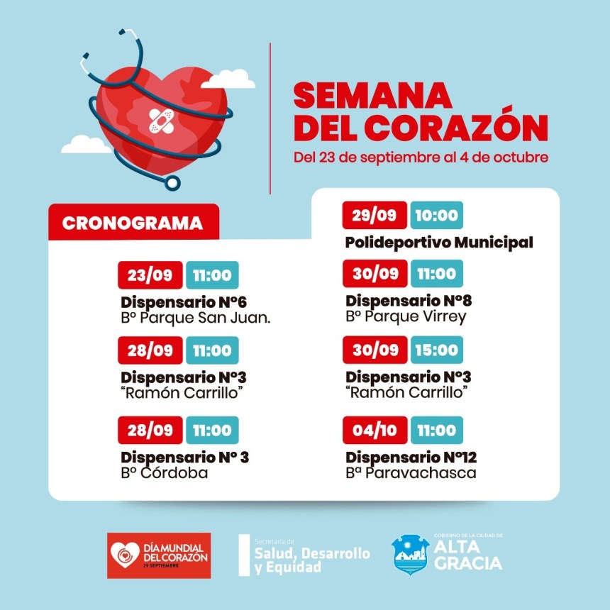 La Semana del Corazón consiste en una serie de actividades organizada por la Secretaría de Salud, Desarrollo y Equidad del Gobierno de la ciudad de Alta Gracia y tiene como objetivo concienciar e informar a los vecinos de la necesidad de desarrollar hábitos de vida saludables como medida de prevención frente a las enfermedades cardiovasculares.