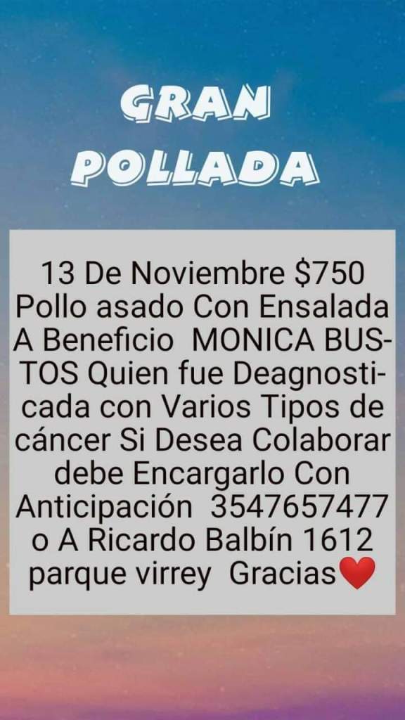 Es por ello, que para este sábado 13 de noviembre se organizo una nueva pollada solidaria, consistiendo en un pollo asesado con ensalada por el valor de $750; a retirar en horas del mediodía por calle Ricardo Balbín 1612, en barrio Parque del Virrey.