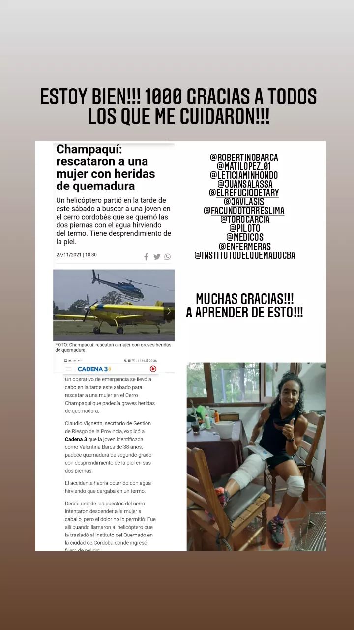 Desde uno de los puestos del cerro intentaron descender a la mujer a caballo, pero el dolor no lo permitió. Fue allí cuando llamaron al helicóptero que la trasladó al Instituto del Quemado en la ciudad de Córdoba donde ingresó fuera de peligro.