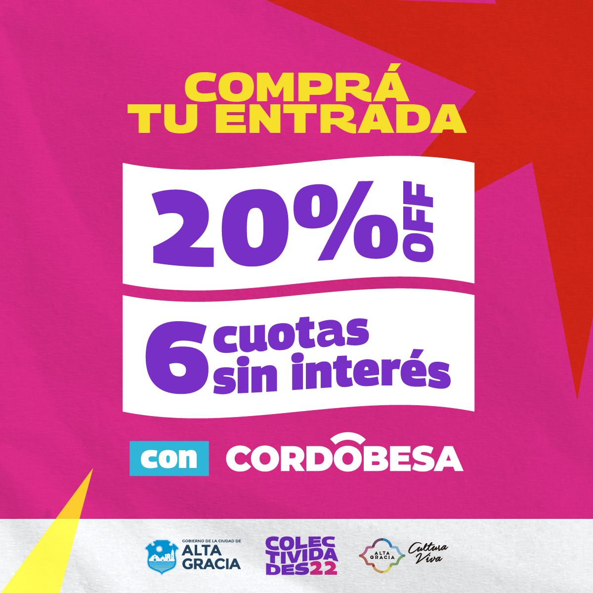 Si sos de Alta Gracia, podés acceder a una bonificación del 50% acercándote a la boletería del Cine Teatro Monumental Sierras. Además, con Tarjeta Cordobesa tenés 6 cuotas sin interés y un descuento del 20%.