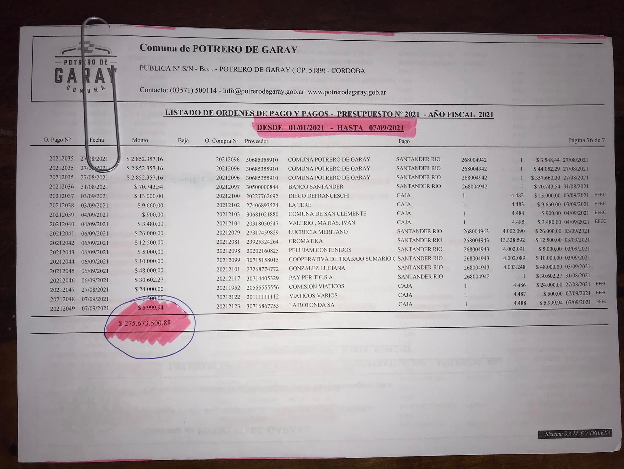 – NO SE RINDIERON COMPROBANTES DE PAGOS POR UNA SUMA TOTAL DE $ 275.673.500,88, pagos que de acuerdo al sistema salieron en el periodo de Gestión de Martínez/Iriarte.