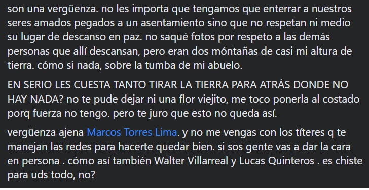 «Son una vergüenza. No les importa que tengamos que enterrar a nuestros seres amados pegados a un asentamiento, sino que no respetan ni medio su lugar de descanso en paz. No saqué fotos por respeto a las demás personas que allí descansan, pero eran dos montañas de mi altura de tierra, cómo si nada, sobre la tumba de mi abuelo.»
