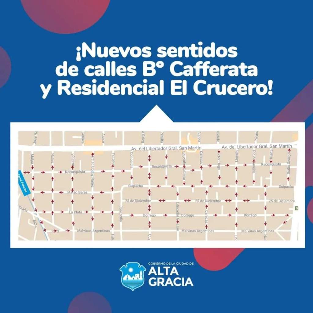 A través de la Ordenanza N° 11967, sancionada el 20 de octubre pasado en el Concejo Deliberante, el Municipio de Alta Gracia, y puntualmente la Secretaría General, ya reglamentó y puso en vigencia el cambio de sentido de distintas calles de Barrio Cafferata, como así también del contiguo El Crucero, e incluso un pequeño sector de San Martín.