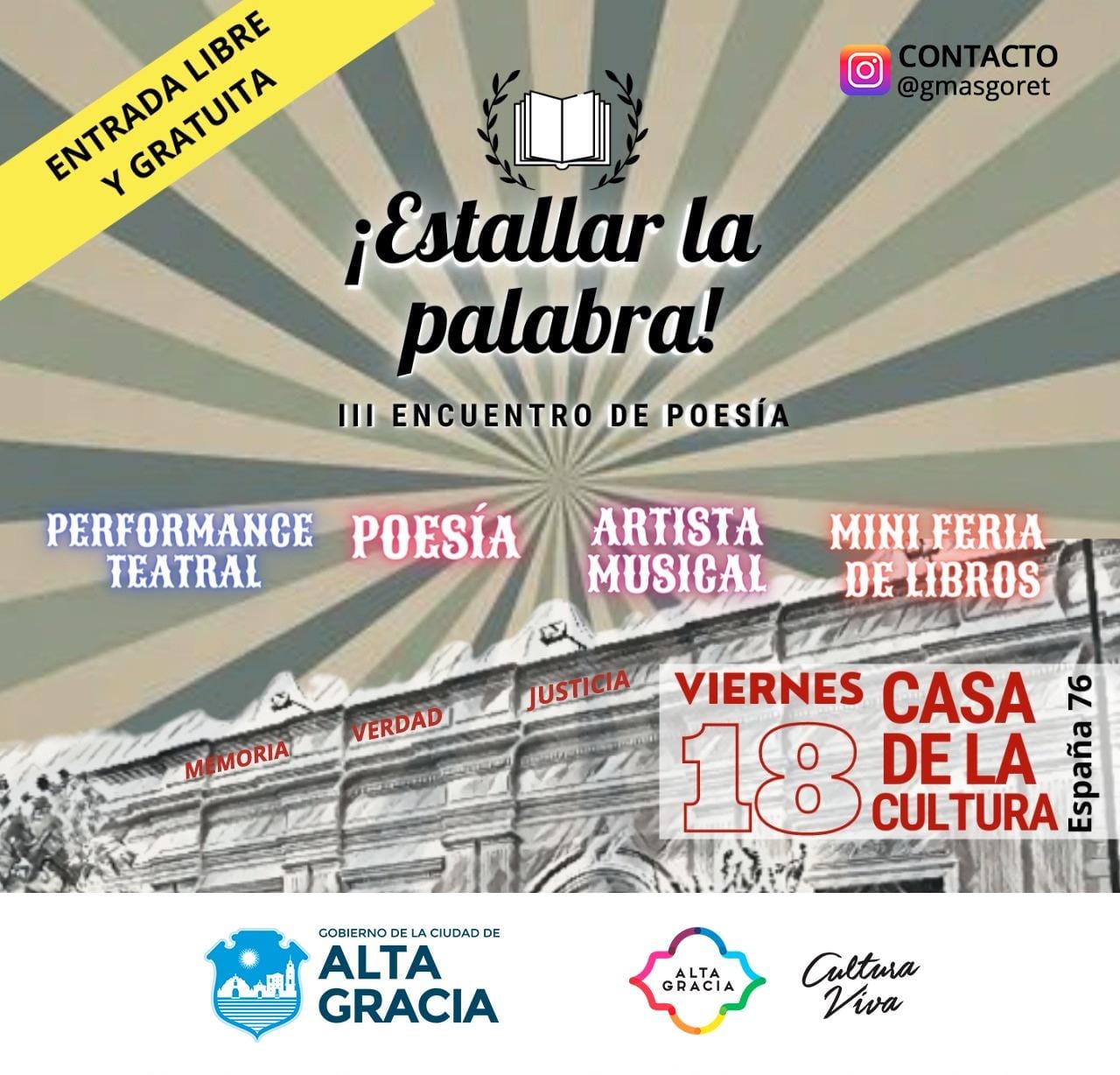 Quienes deseen participar recitando su poesía, pueden reservar su espacio en el micrófono comunicándose con @gmasgoret en redes sociales, o vía Whatsapp al número 3517524931.