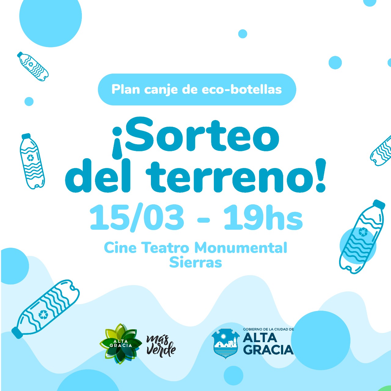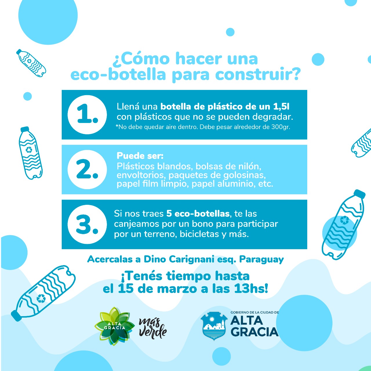En el marco del programa Plan Canje de Eco-Botellas, implementado por el Gobierno de la Ciudad de Alta Gracia a través de la Secretaría General de Ambiente y Transporte, se realizará el sorteo del terreno previsto entre los vecinos que hayan traído 5 Eco-Botellas (envases de Pet rellenos de materiales plásticos), a la Secretaría de Ambiente ubicada en calle España 72; donde se las recibirán hasta el mismo 15 de marzo hasta las 13:00 hs.