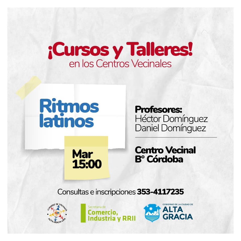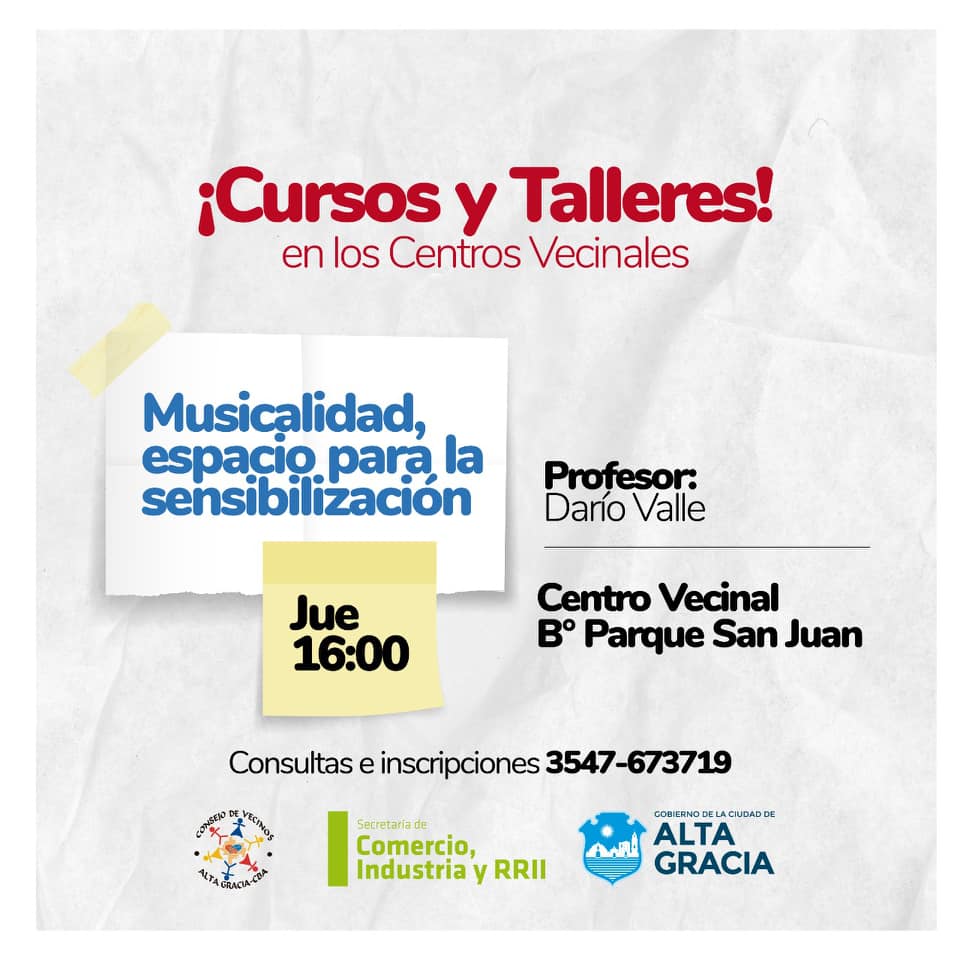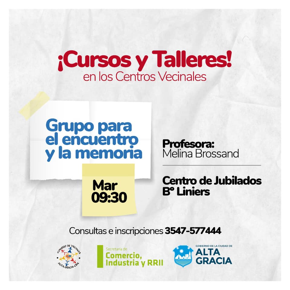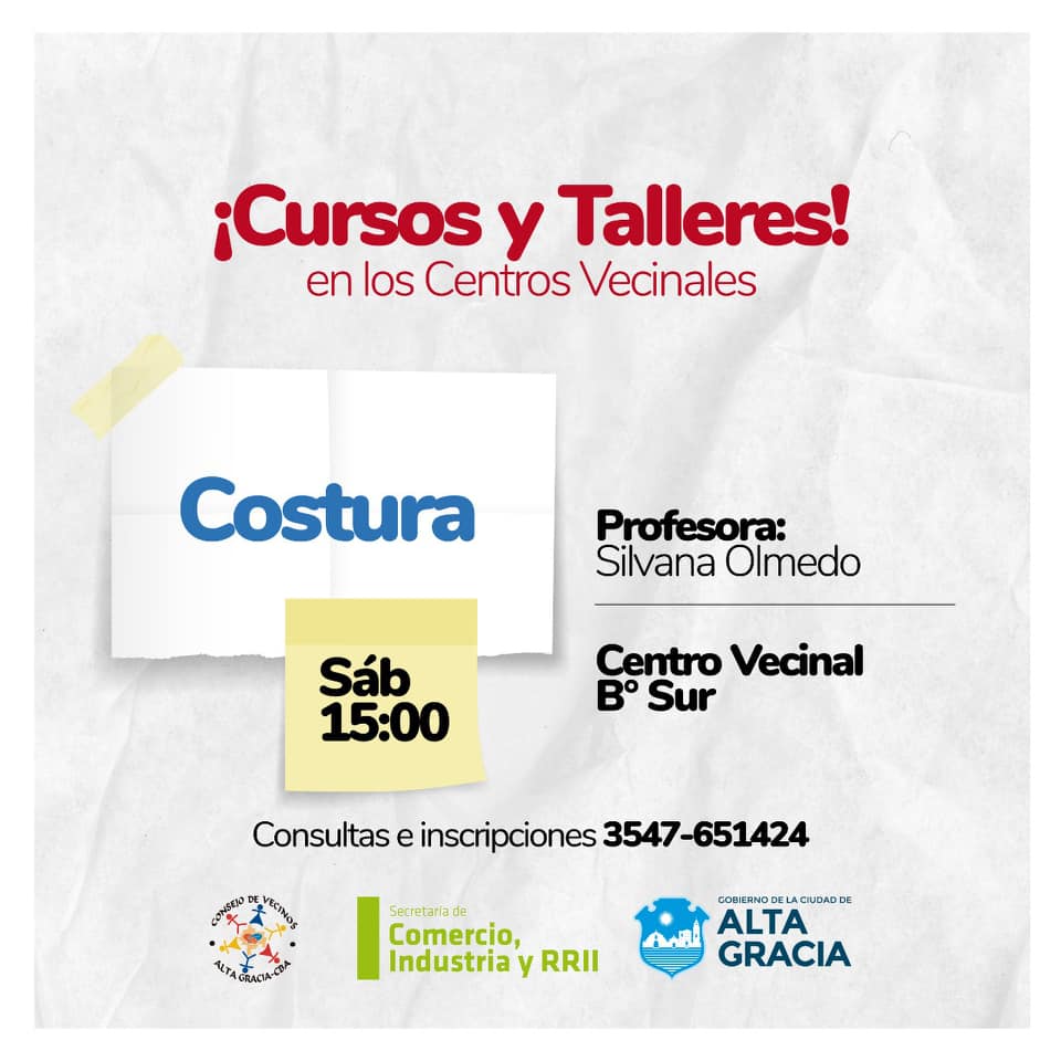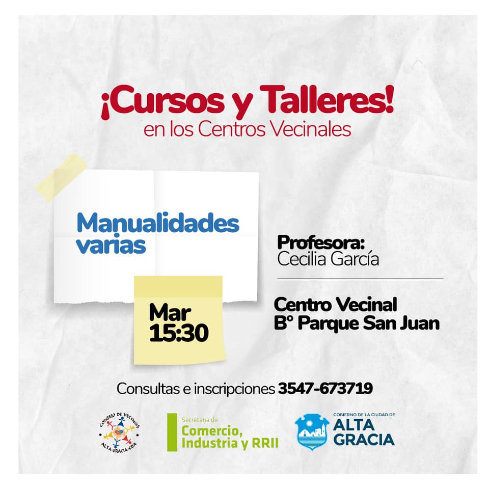 La Secretaría de Comercio, Industria y Relaciones Institucionales, del Municipio de Alta Gracia, informa que ya están abiertas las inscripciones de los Talleres Municipales, en los diferentes centros vecinales de la ciudad.