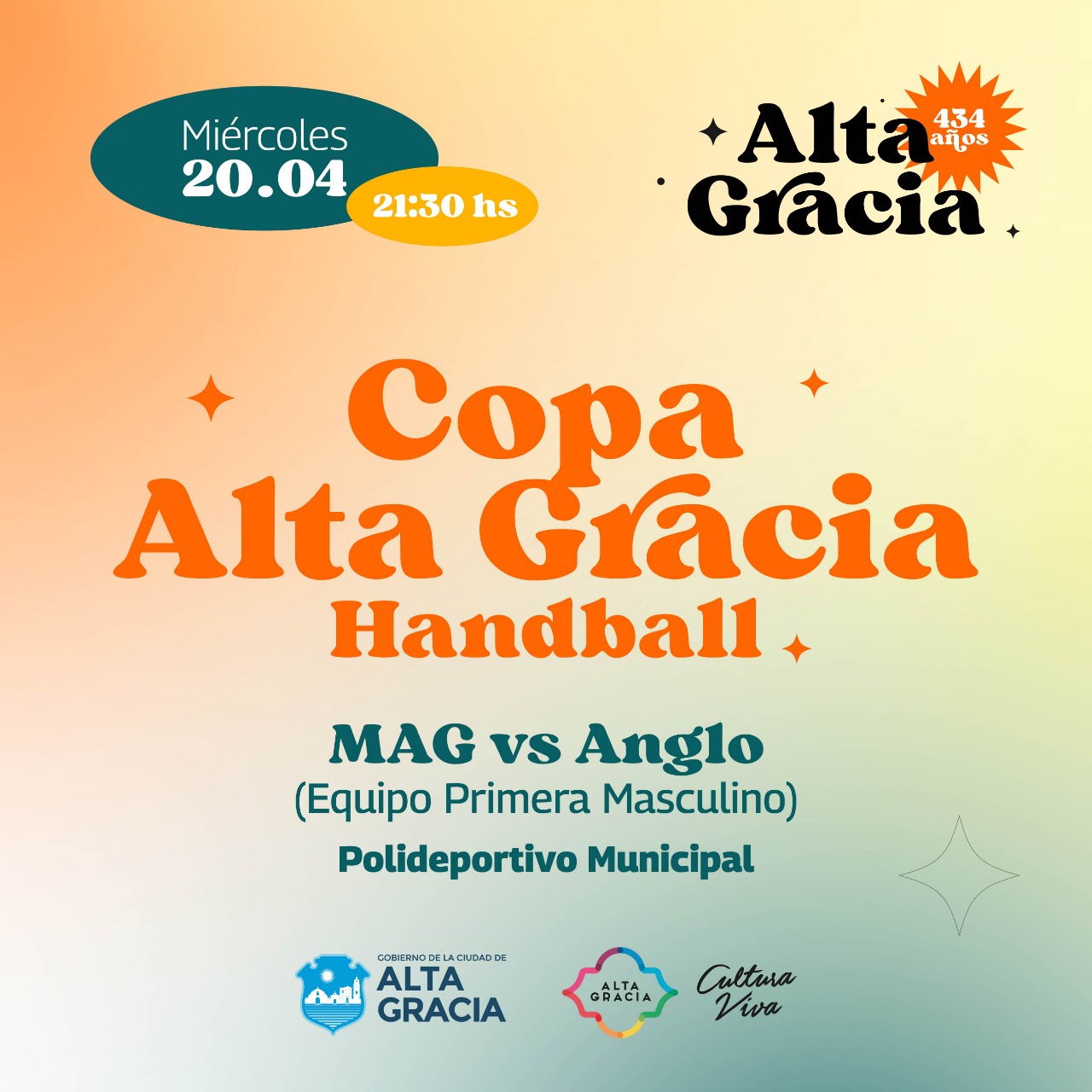 En el marco de las actividades conmemorativas por el aniversario de la ciudad organizadas por la Dirección de Deportes Municipal en la noche de hoy miércoles 20 de abril se disputará la Copa Ciudad de Alta Gracia de Handball en el Polideportivo Municipal a las 21:30 entre los equipos de 1° División del Colegio Anglo Americano y el representativo de la Municipalidad de Alta Gracia.
