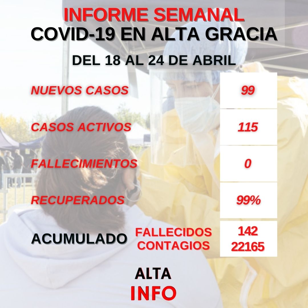 A la fecha Alta Gracia acumula un total de 22165 casos positivos de Covid-19, desde que comenzó la pandemia; de los cuales el 99% se trata de pacientes ya recuperados de la enfermedad. A su vez 115 personas se encuentran en aislamiento domiciliario. Por el momento hay un registro de 142 personas fallecidas.