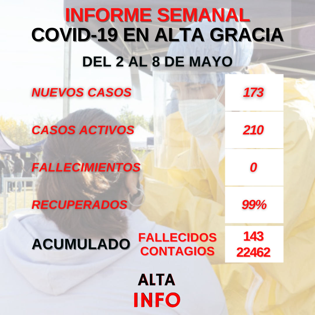 En la ciudad de Alta Gracia, en la semana comprendida del 2 al 8 de Mayo, se confirmaron 173 nuevos casos positivos de Covid-19 por parte del Municipio local.