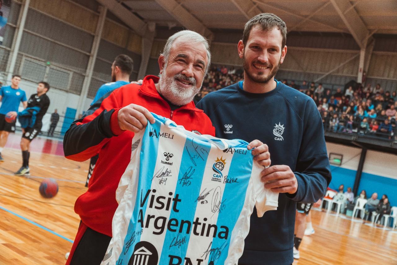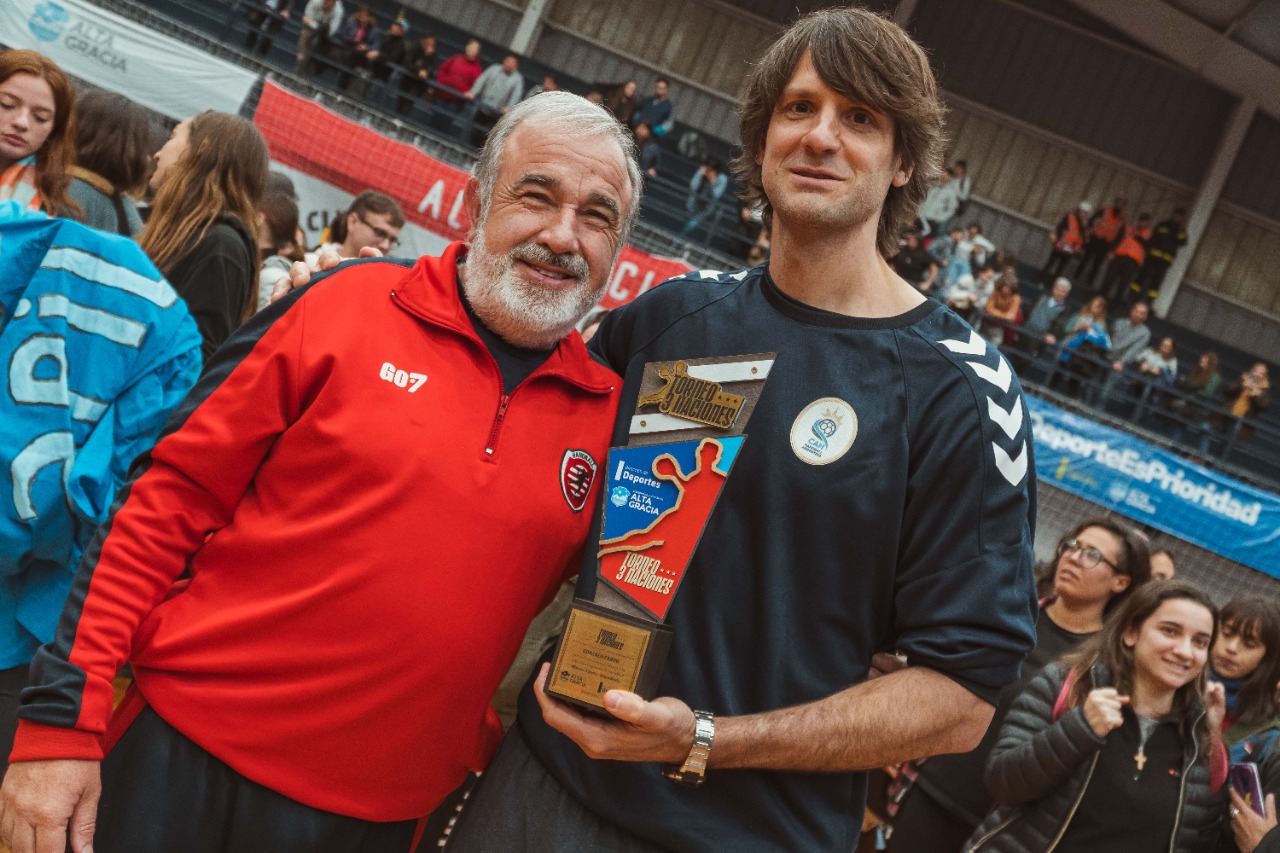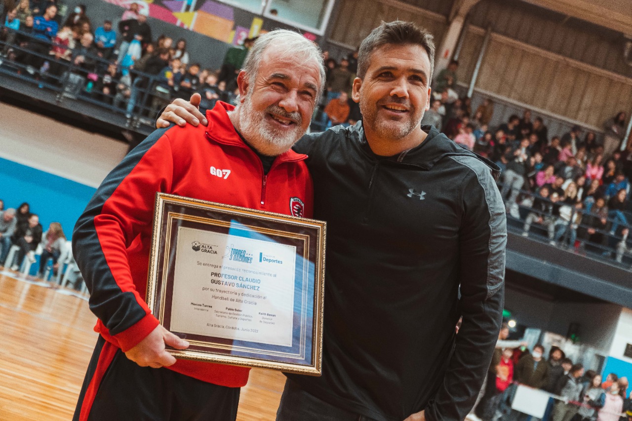 En la previa del partido, el Intendente Marcos Torres entregó reconocimientos a los tres seleccionados en agradecimiento a su participación, a Oscar “Pichi Campana” por el apoyo constante al deporte local y, con un emotivo homenaje, al Profesor Claudio Sánchez, técnico histórico del Handball de Alta Gracia.