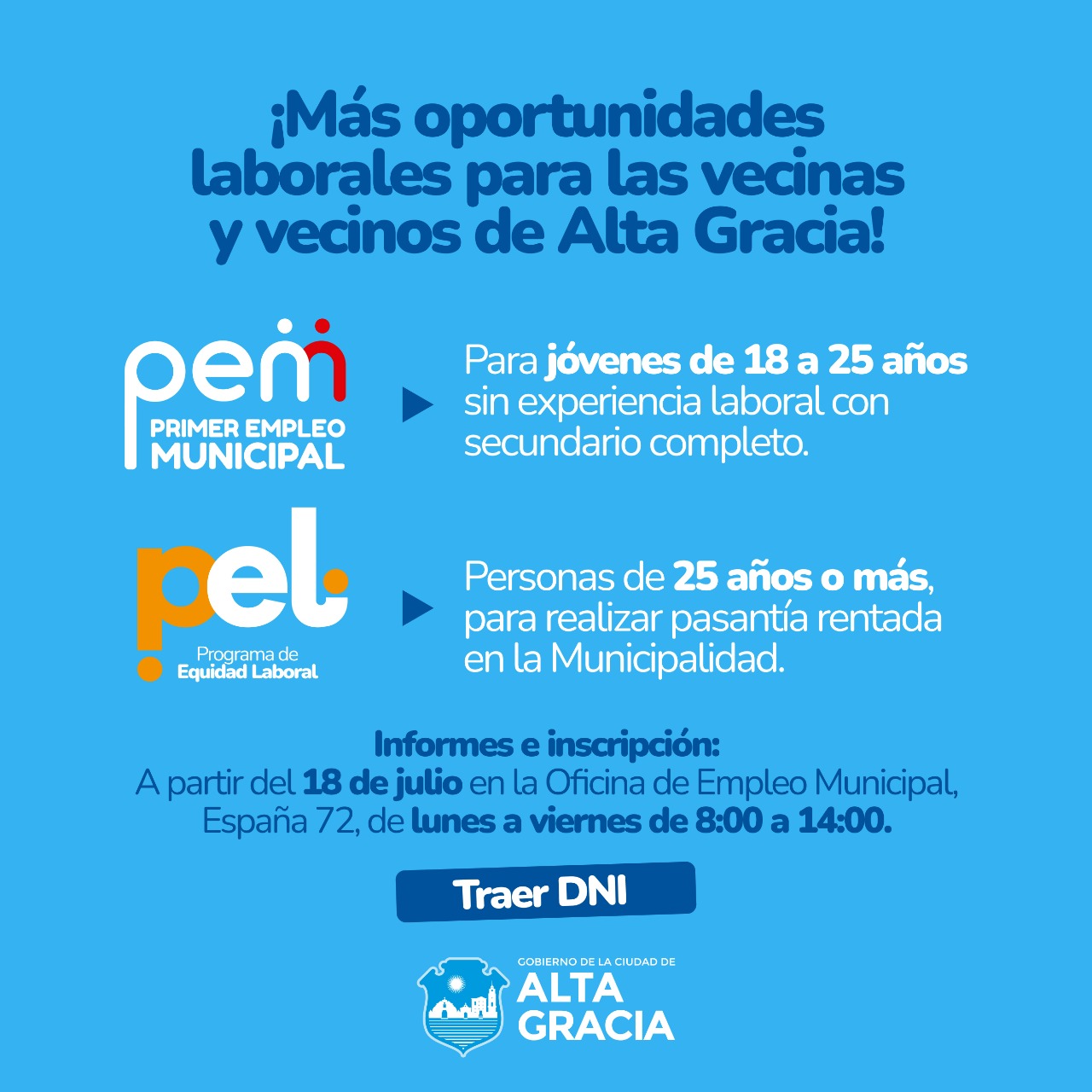 ● Pueden acceder al programa jóvenes de 18 a 25 años inclusive, desempleados, sin experiencia laboral relevante, tanto estudiantes de carreras universitarias o terciarias, como no estudiantes que tengan secundario completo y que registren domicilio en la ciudad de Alta Gracia. El cupo se cubrirá con perspectiva de género 50%.