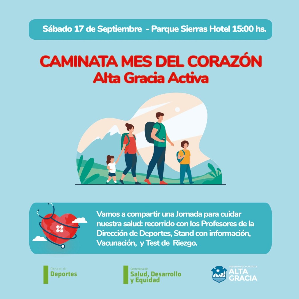 El Municipio de Alta Gracia, a través de la Secretaría de Salud Desarrollo y Equidad invita a vecinas y vecinos, el día 17 de septiembre a partir de la hora 15, a una jornada en el Parque del Sierras Hotel, en el marco de las actividades organizadas por el Mes del Corazón.