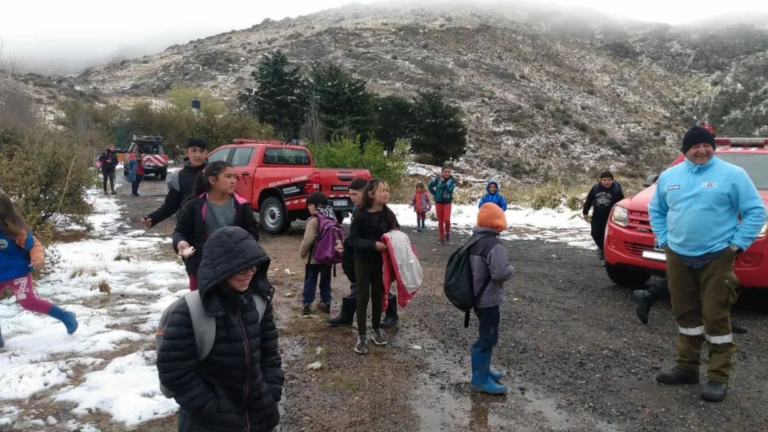 Inmediatamente, y con las precauciones requeridas para la situación, los móviles policiales se pusieron a disposición de 13 niños y 3 docentes del colegio para poder sacarlos de la zona sin peligro en medio de la tormenta de nieve.