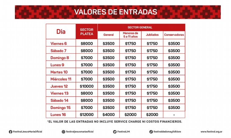 La entrada general tendrá un costo de $3.500 (más costo por servicio). El lunes 16, ese precio se incrementa a $ 4.000 más el servicio.