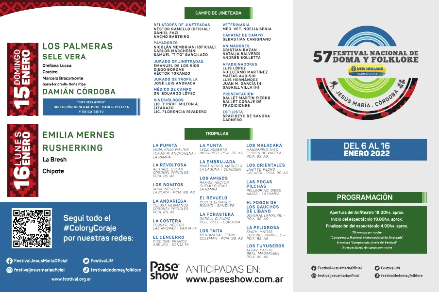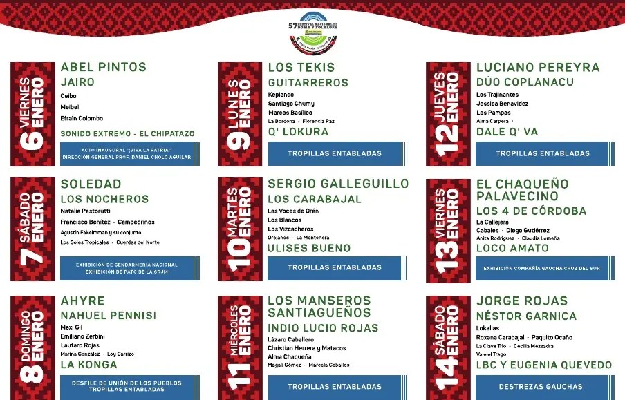 El 57° Festival Nacional de la Doma y Folclore de Jesús María anunció la grilla de figuras que darán luz y color a la fiesta que se desarrollará del 6 al 16 de enero.
