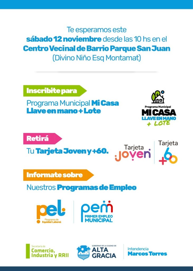 A partir de este sábado 12 de noviembre, la Secretaría de Comercio, Industria y Relaciones Institucionales del Gobierno de Alta Gracia recorrerá distintos puntos de la ciudad, comenzando por el Centro Vecinal de Barrio Parque San Juan.