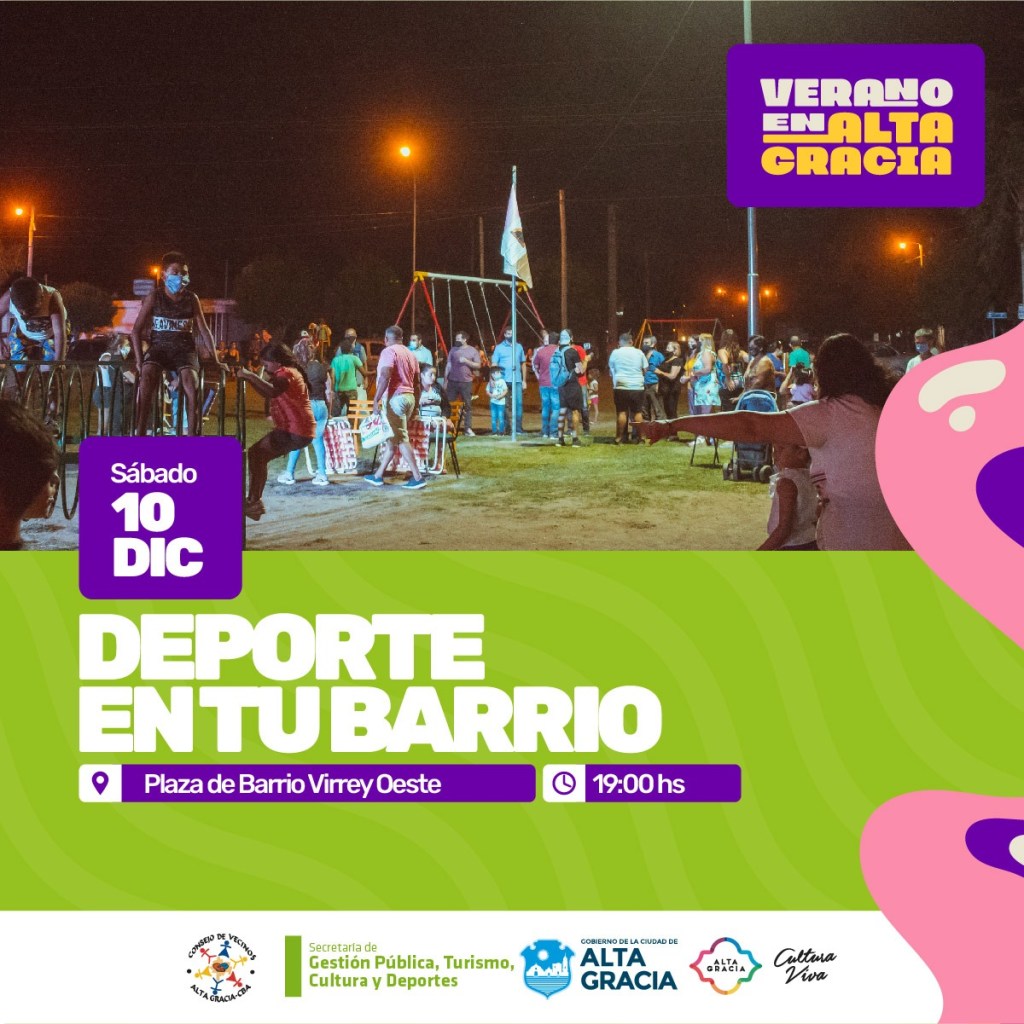 - El Deporte en tu Barrio: El deporte se hace presente en cada plaza de los diferentes barrios de Alta Gracia, con una propuesta lúdica y entretenida que incluye Deporte recreativo, ferias y música. El sábado 10, el evento será en barrio Parque Virrey Oeste.