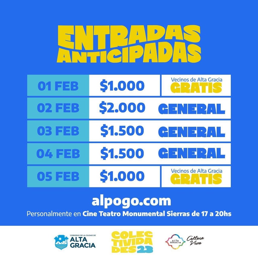 En ambos casos, los vecinos y vecinas podrán buscar sus entradas por el Cine Teatro Monumental Sierras, o por la “Casita de Colectividades” sita en José Hernández a metros de la intersección con calle Bolivia, junto al Polideportivo Municipal, de lunes a viernes de 18 a 20hs. Se informa que los interesados deberán asistir con DNI con domicilio en Alta Gracia, entregándose dos entradas gratuitas por persona.