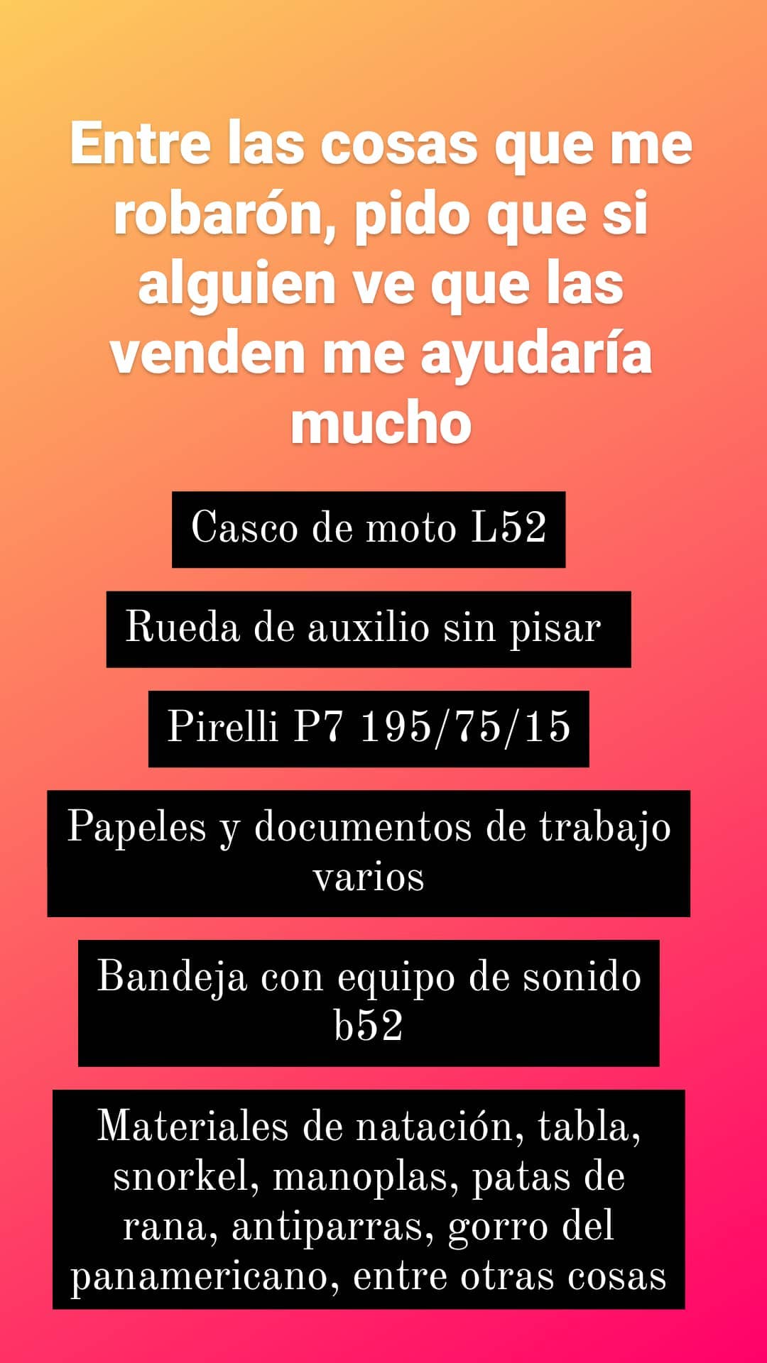 Puntualmente, Franco pide que le avisen si llegan a saber de la venta de una tabla snorkel, manoplas, patas de rana, antiparras y un gorro del Panamericano, entre otros elementos.