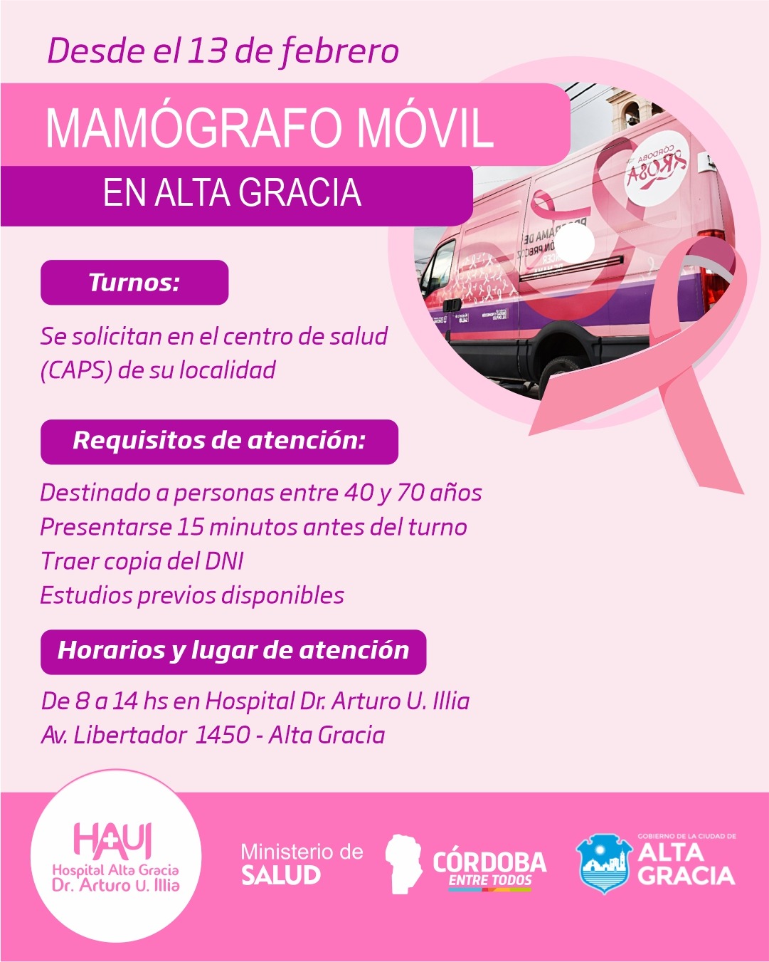 En una gestión conjunta de la Secretaría de Salud, Desarrollo y Equidad Municipal y el Hospital Regional Arturo Illia, el mamógrafo móvil estará disponible en Alta Gracia a partir del lunes 13 de febrero.