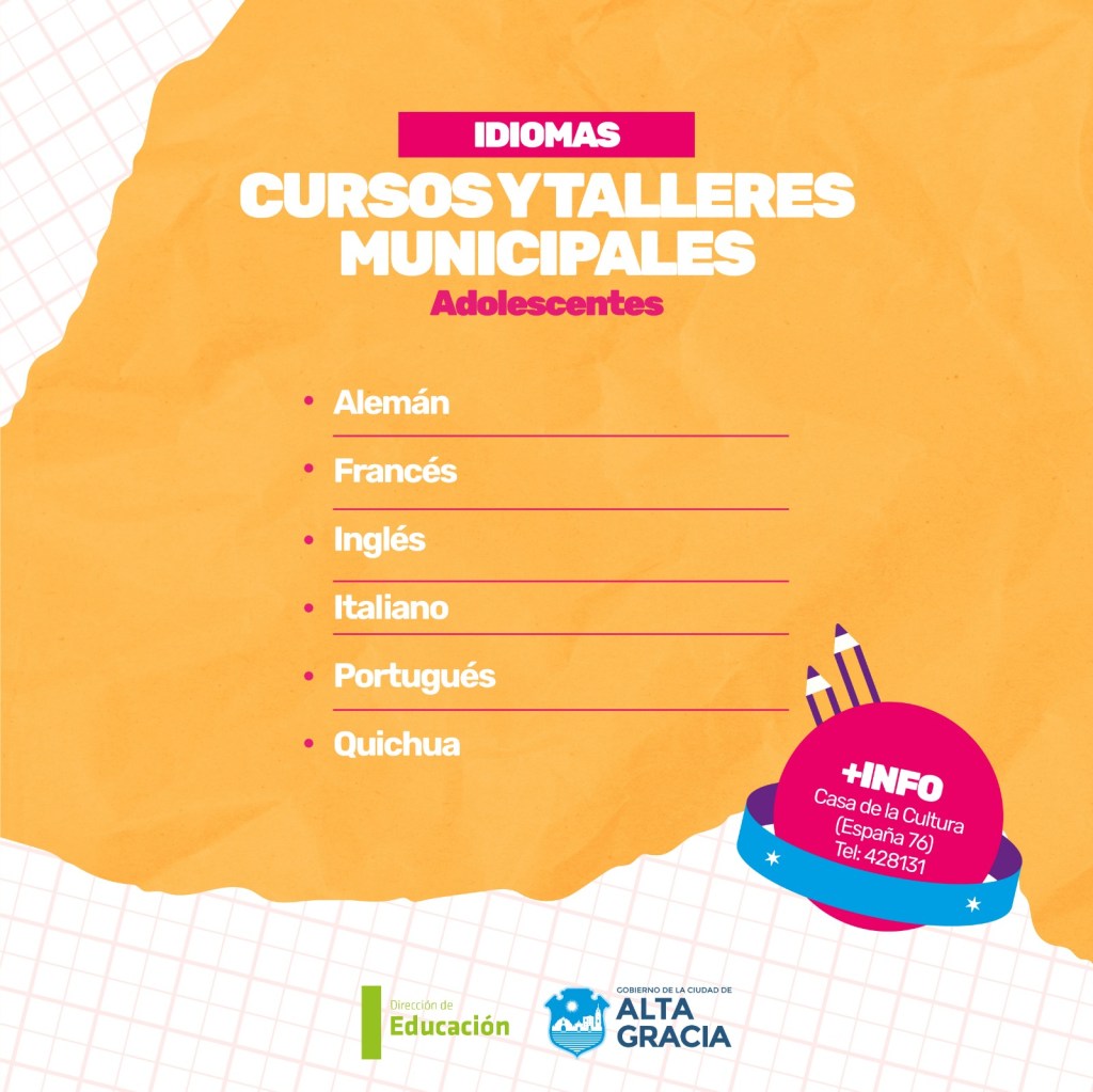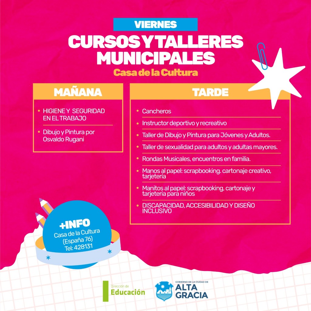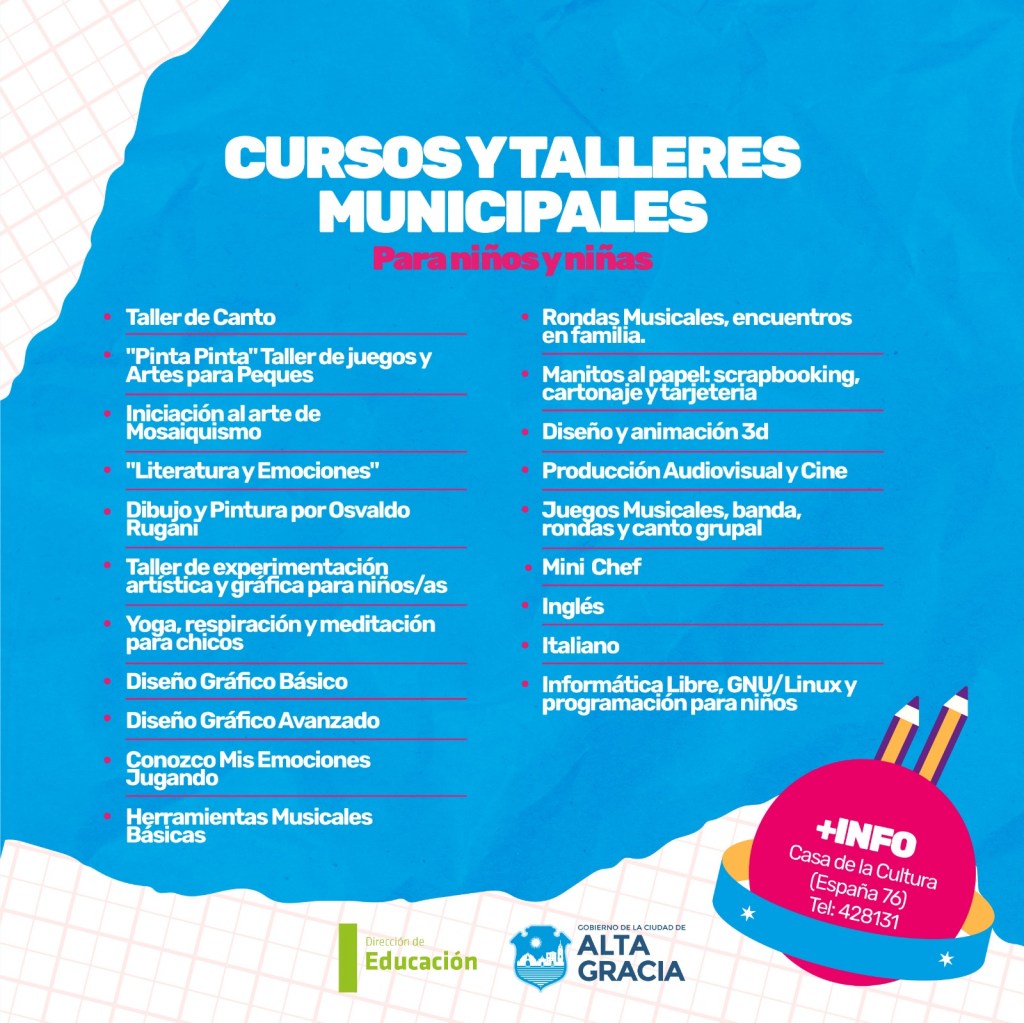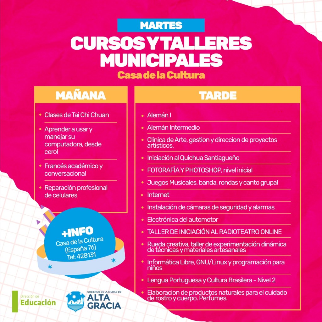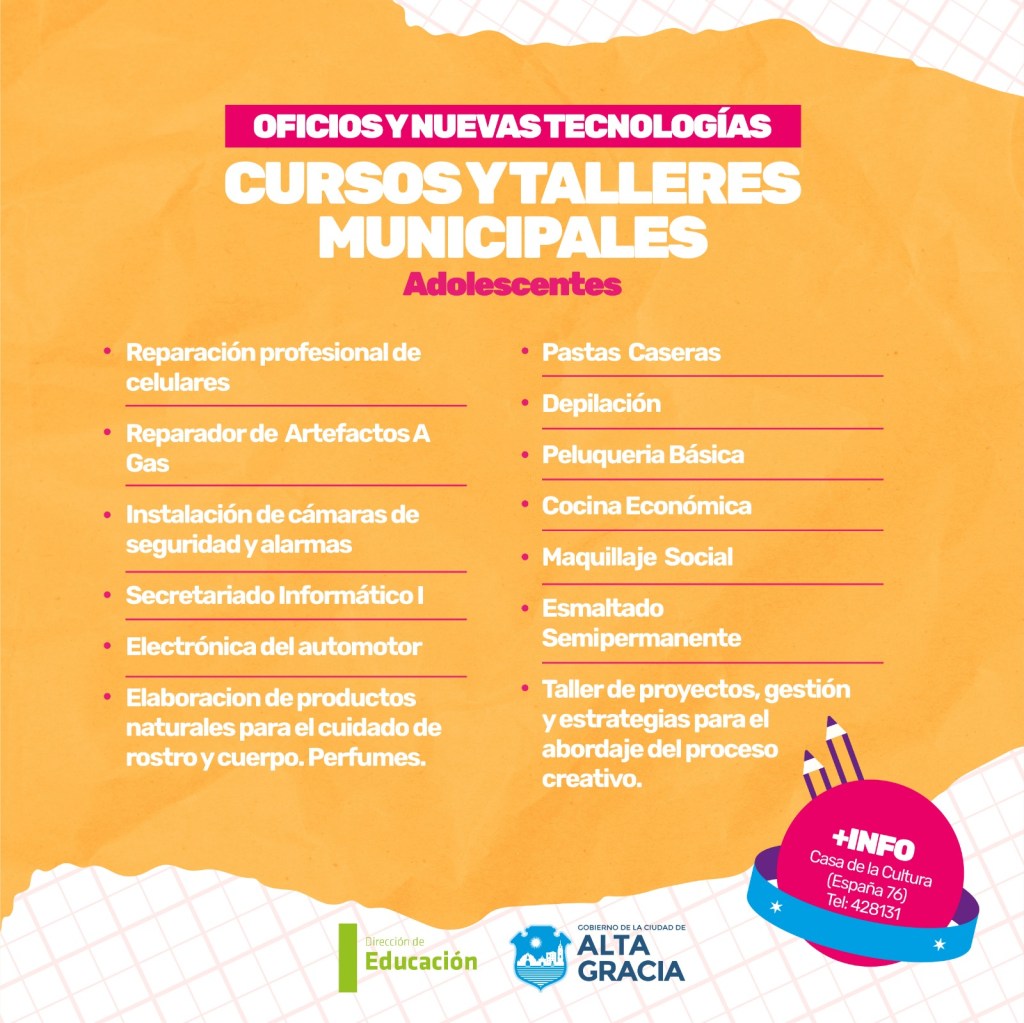 Por primera vez, la Dirección de Educación dependiente de la Secretaría de Gestión Publica, Turismo Cultura y Deportes del Gobierno de Alta Gracia, pone a disposición más de 100 propuestas de formación en oficios, arte, salud, idiomas, nuevas tecnologías y ambiente, con la intención de brindar más educación y con ello más oportunidades a los vecinos y vecinas de nuestra ciudad.